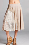 Description: Flared crinkle cotton midi skirt with a sheer lace contrast panel that sweeps diagonally across the front. Finished with an invisible size zipper. Lined with a mini skirt. Pair with an oversize sweater and booties.