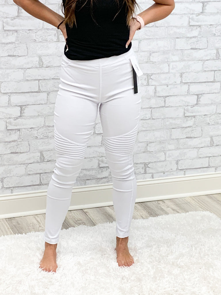 Description: SOLID COTTON BLEND STRETCH MOTO PANTS WITH BACK POCKETS