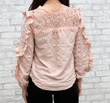 - SOLID TEXTURED WOVEN TOP - ROUND NECK WITH LACE - LONG SLEEVE WITH RUFFLE - FRONT LACE YOKE - BACK KEY HOLE WITH BUTTON CLOSURE