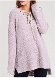 Description: Solid boucle knit sweater top with lace-up neck and long sleeves.