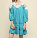 Description: Puff Sleeve Ruffle Hem Keyhole Dress with Crochet Yoke and Folded Pleat Details