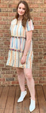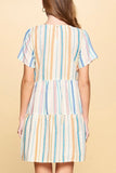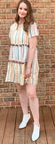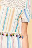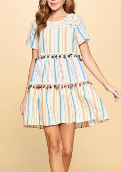 Description: Multi-colored striped printed dress featuring short sleeves, laced yoke, and tiered pom-pom trims.