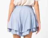 Solid tiered shorts with skirt overlay detail. Zipper closure at back. Lined. Non-sheer. Woven. Lightweight.