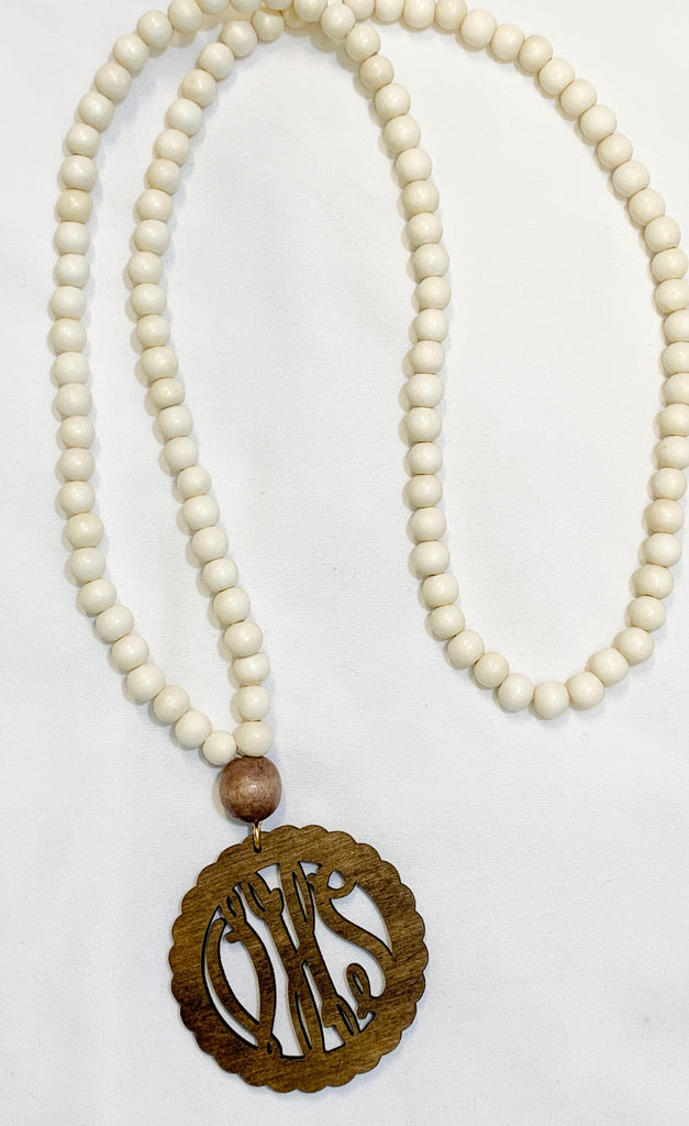 Dress up your wardrobe with this cute personalized necklace. Pendant is mocha wood with white wood beads. Pendant shape and font can be customized.