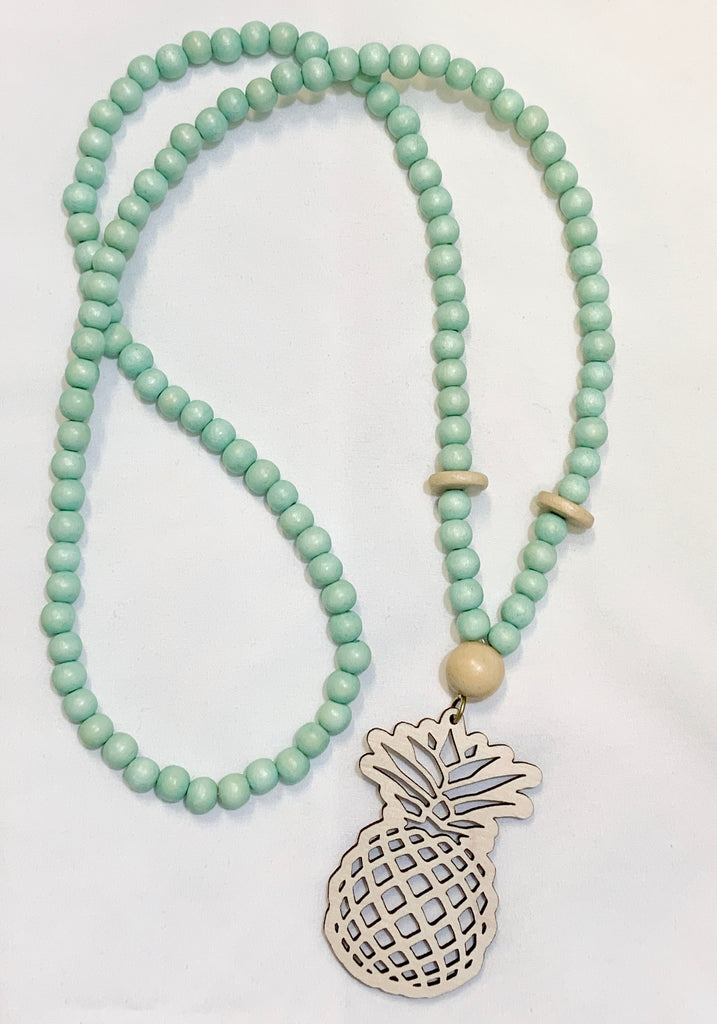 Feel tropical vibes in this cute pineapple necklace. Pendant is wheat wood with mint and natural wood beads.