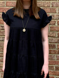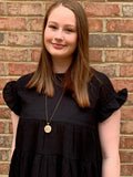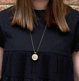 The personalized Tara necklace is a classy and cute statement piece. Pendant size measures 1". Chain is available in bronze. Necklace with pendant measures approximately 31". Engraving will be in a bronze fill.