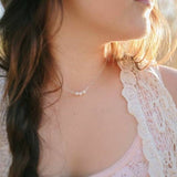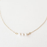 Three little white Swarovski pearls are wire wrapped onto a gold filled chain. Lovely and simple little pearl necklace. Great for wedding parties or a tiny bit of pearl for everyday. Necklace measures 16 inches as shown on model. Great for gifts and layering.