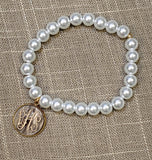 Pearl bracelet with a personalized charm. Charm measures 18mm. Charm is available in stainless steel with a gold or silver plating. Engraving will match metal color chosen.