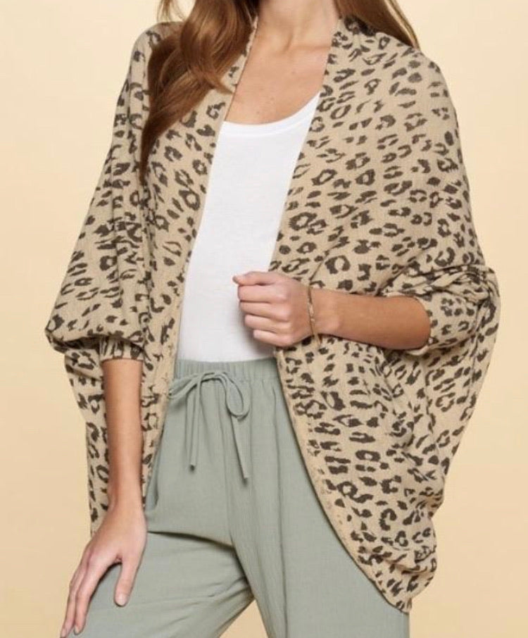 Description: Leopard printed open-cardigan featuring 3/4 length dolman sleeves.