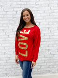 Description: GOLD FOIL LETTERING LOVE TOP 65% RAYON 32% POLY 3% SPAN
