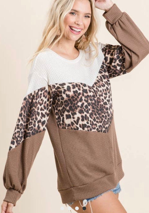Waffle Knit Leopard Colorblock Top (S-3X)