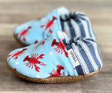 These are one-of-a-kind, handmade moccasins that can be paired with any outfit. Each pair is made with durable cloth and layers of felt and lined with luscious fleece for extra comfort. A heel guard reinforces the quality of the moccasins, while the bottom allows for the baby's to grip the floor as they learn to walk.